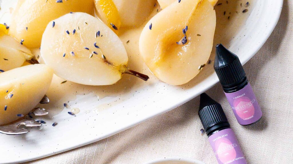 Now, let’s talk flavour! The combination of lavender, thyme, and a hint of lemon served with vanilla cream makes these pears so flavourful and quite irresistible. The lavender adds a floral elegance to the poached pears, while the Tahitian Bean Flavour Drops infuse the whipped cream with a decadent richness that’ll have you coming back for seconds (and maybe even thirds).