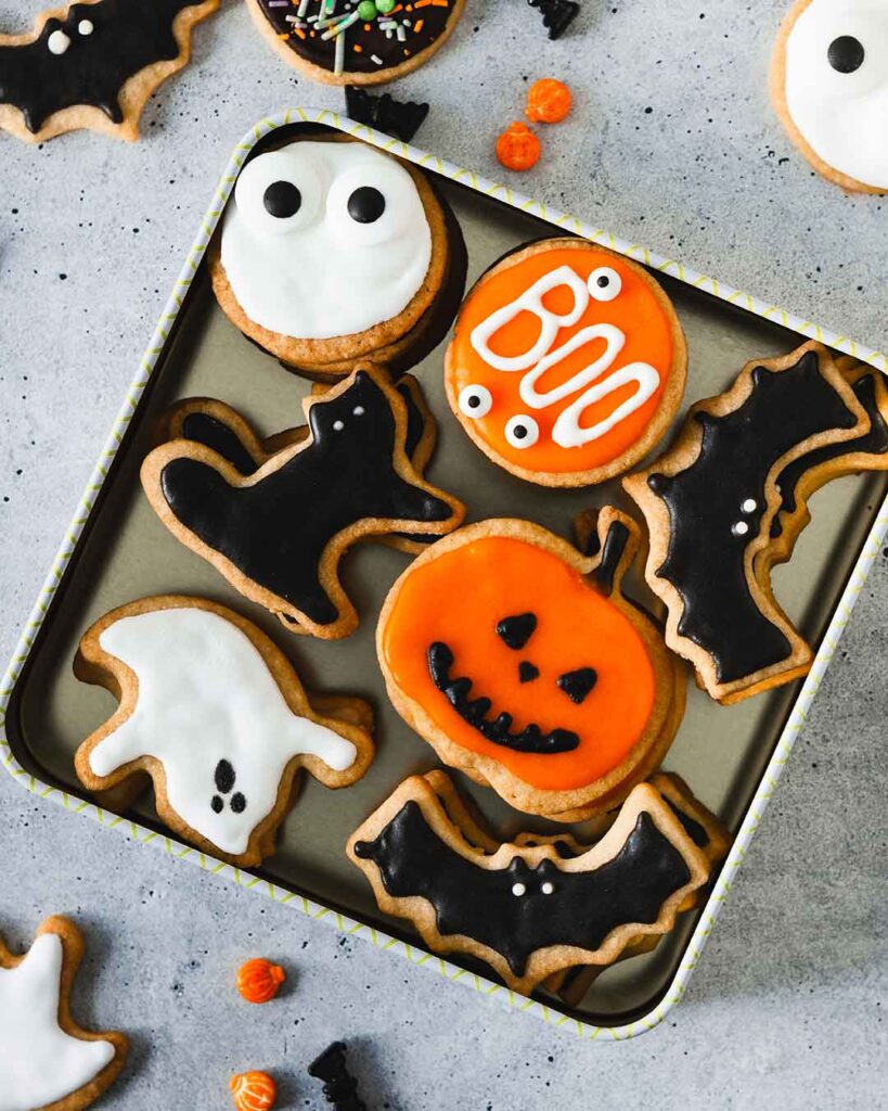 - Bat Cookies: Start with a black icing base for the bat’s body. Use white icing to pipe on eyes, and add colourful accents like purple or blue for a fun pop. Consider adding little fangs with white icing for a cute, spooky touch!