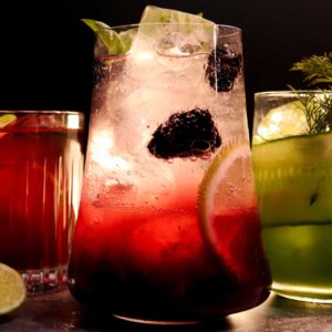 • Strain into the prepared glass and top with club soda. Stir with a tall spoon; garnish with lemon slices and blackberries.