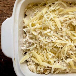 - Place in a 5” baking dish. Top with mozzarella cheese. Bake at 350°F for 20-25 mins until the cheese is browned and the dip is bubbly around the edges.