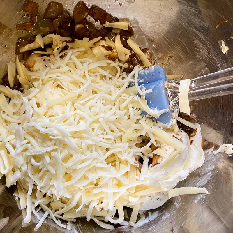 - In a medium-size mixing bowl, add the cream cheese and onion mixture. Stir to combine and then add Swiss cheese.