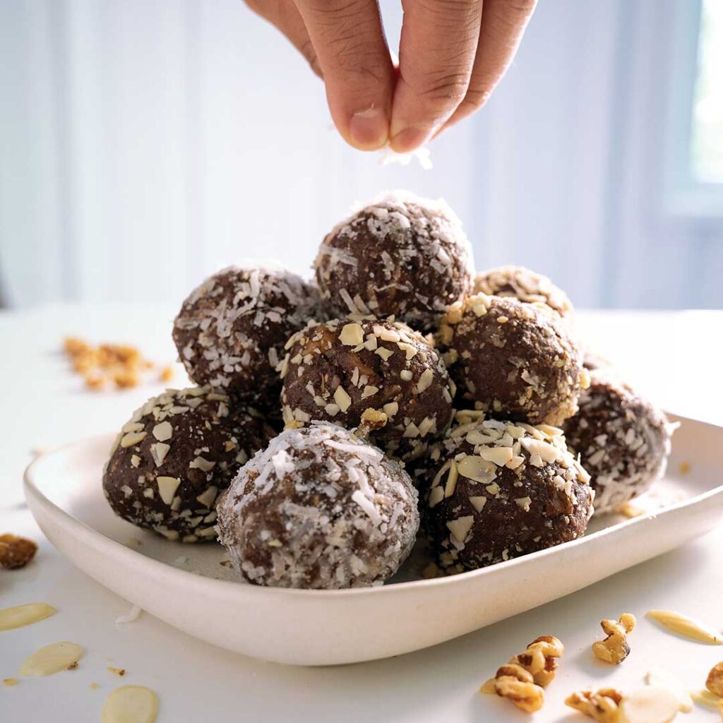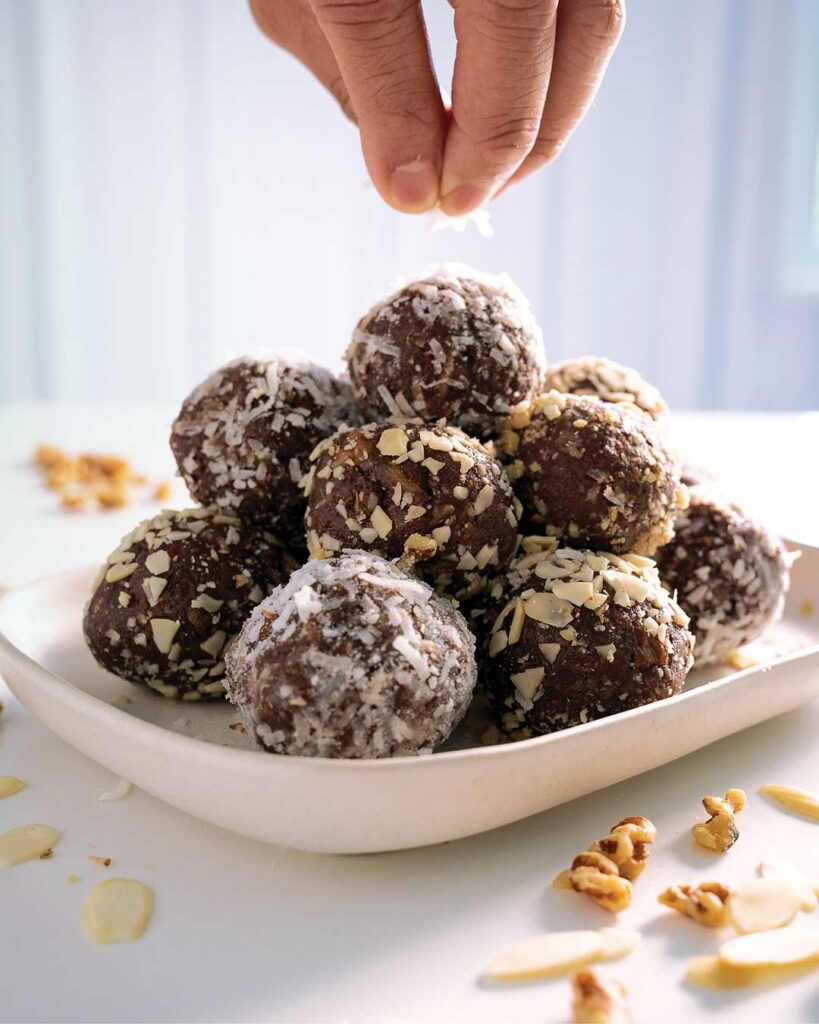 • Grind walnuts and almonds to a fine powder in a food processor. Add softened dates and liquid to the processor and mix to a smooth paste. Add chia seed and coconut and mix to combine. Empty into a bowl, cover, and chill in the fridge for an hour.