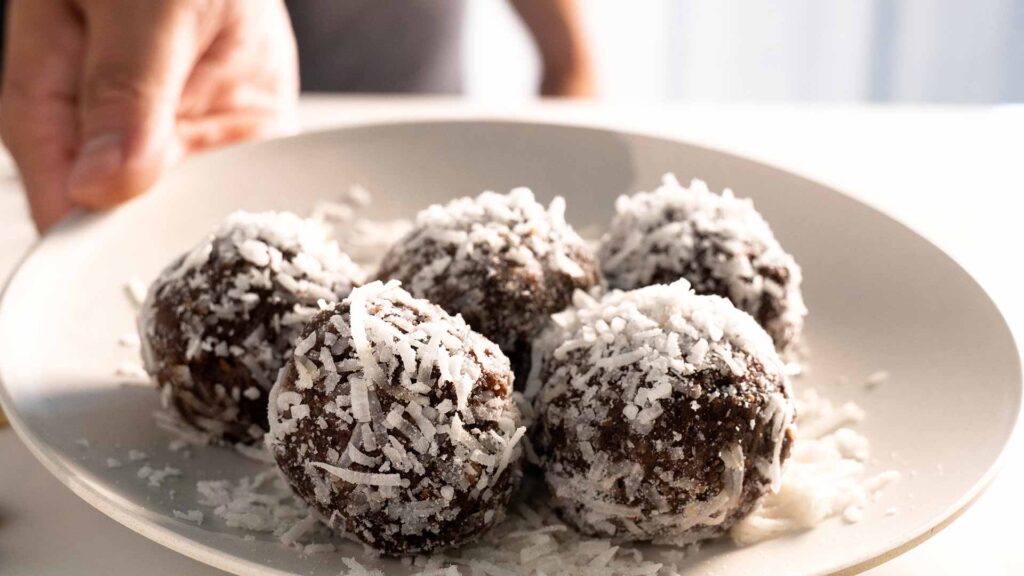 • Scoop balls (a little smaller than golf ball size) and roll in coconut. Keep refrigerated in an airtight container.