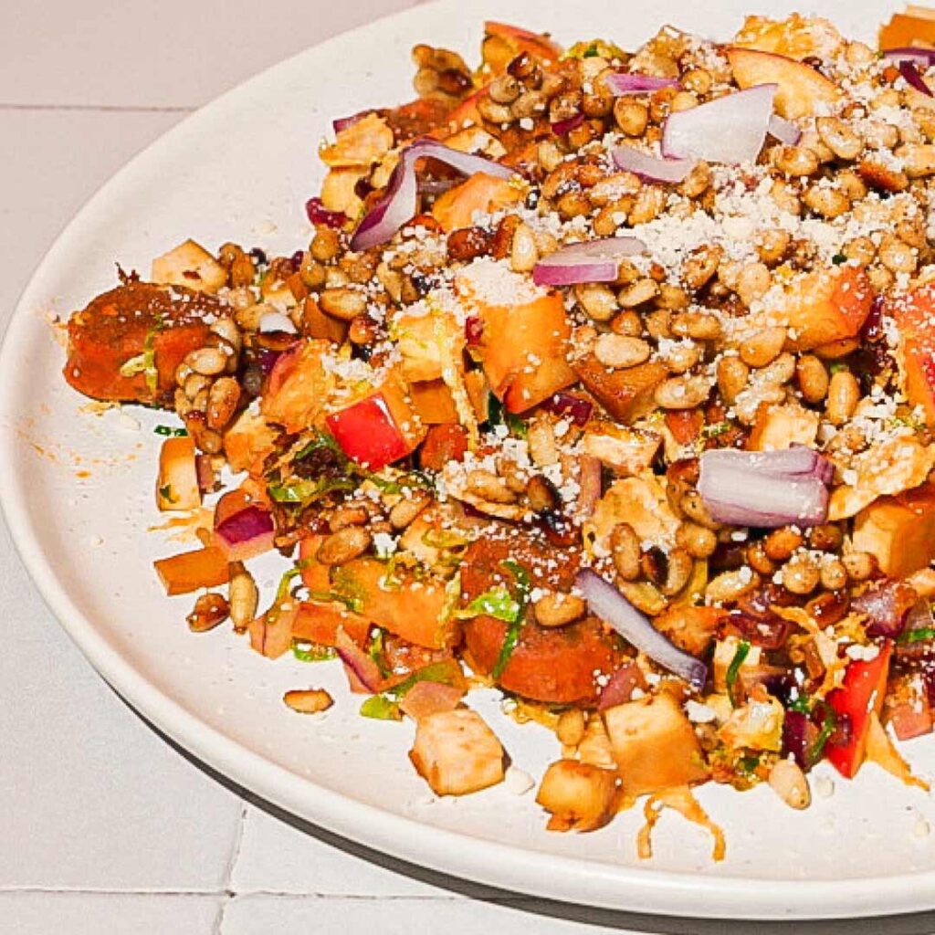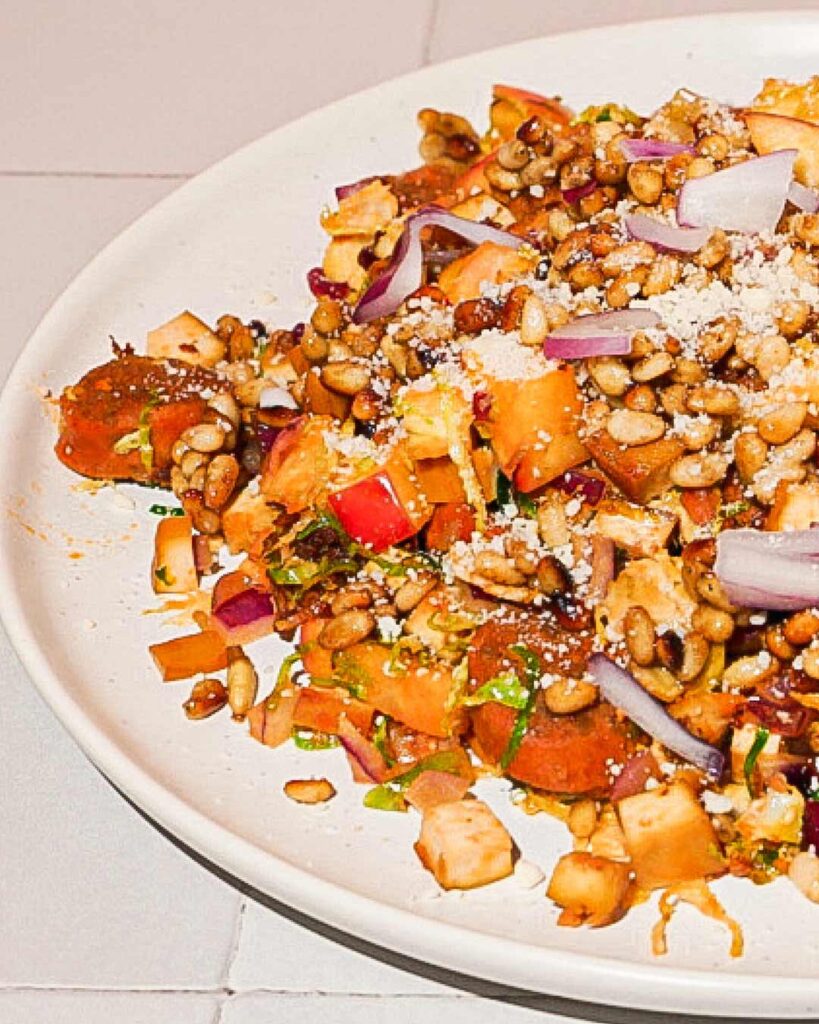 - Place the Brussel mixture on a platter and top with the maple syrup-glazed pine nuts. Serve and enjoy!