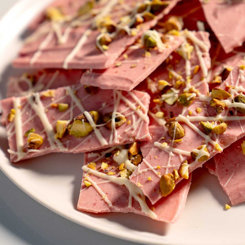 The Rose flavouring is a great combination with the raspberry, making it more floral and warm. The Raspberry flavouring adds the brightness of fresh raspberries to help the freeze-dried berries pop. It is essential to this recipe. Pistachios add just the right amount of crunch and salt to make this chocolate bark the star of your holiday gathering!